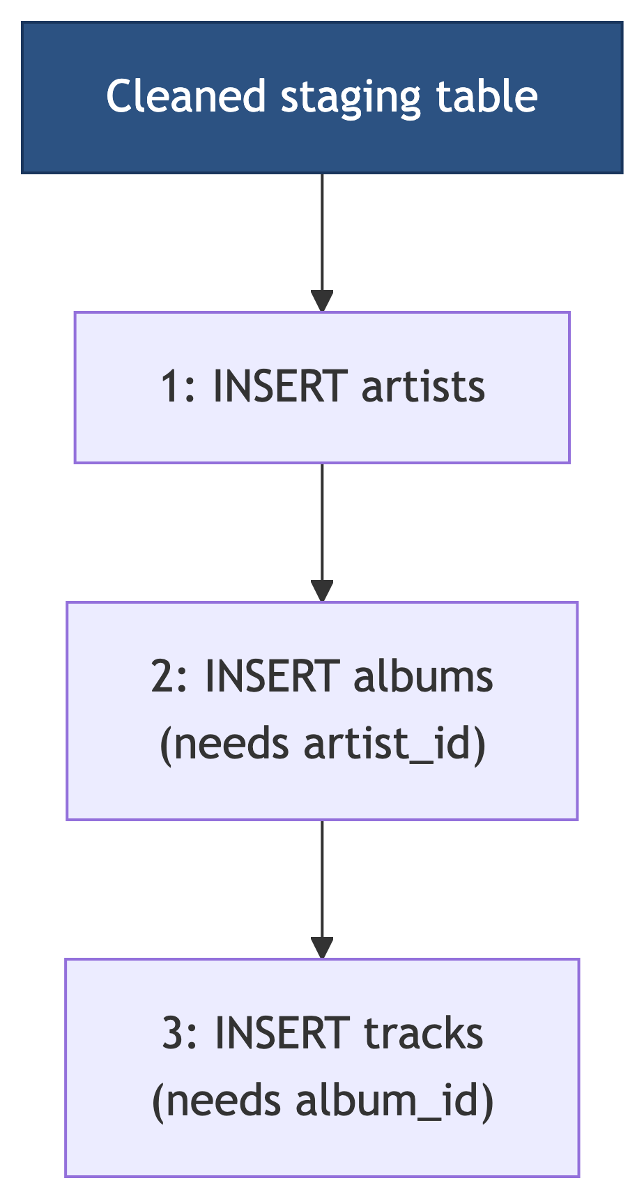 Foreign keys enforce referential integrity. You cannot insert an album with artist_id = 5 if no artist with artist_id = 5 exists yet. It is like trying to RSVP to a party that does not exist. The dependency chain is: artists, then albums, then tracks. Always.