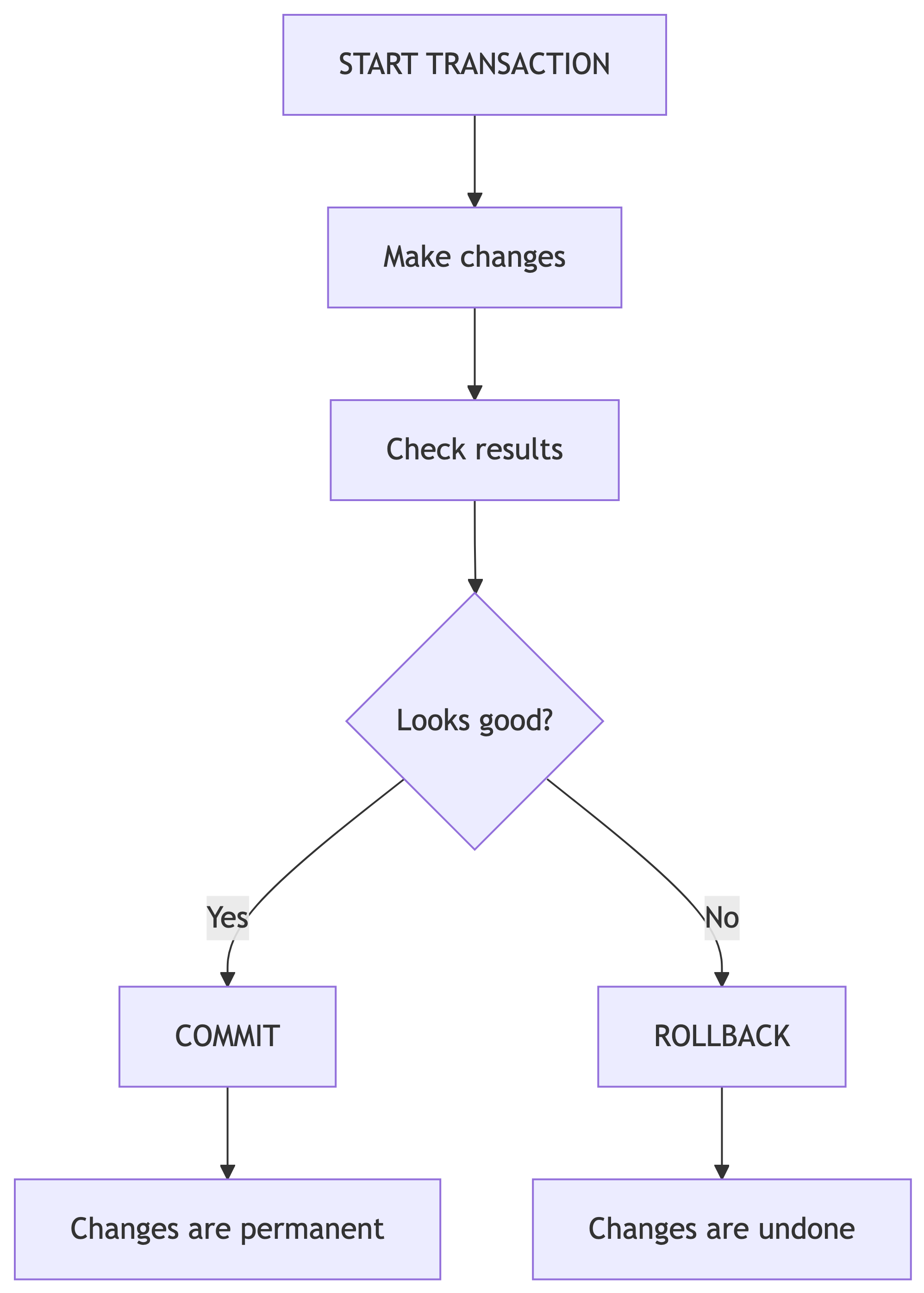 - Use (Apply) transactions (START TRANSACTION, COMMIT, ROLLBACK) to safely preview and revert changes
