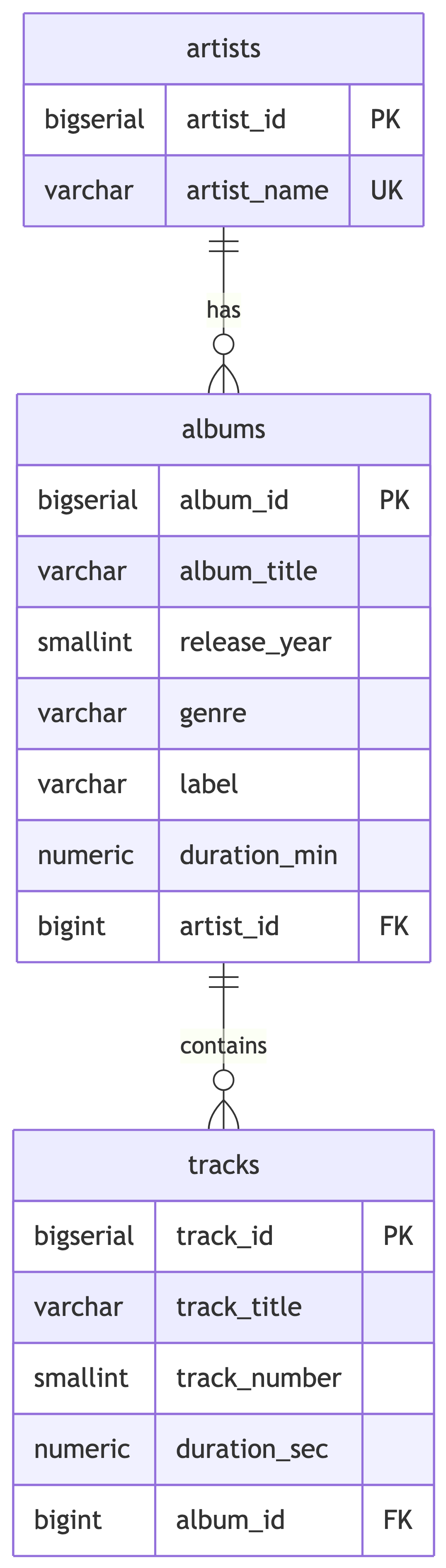 ORDER BY a.artist_name, al.album_title, t.track_number;If this looks right, congratulations. You have successfully cleaned and migrated dirty data into a normalized schema. This is genuinely 80% of what data professionals do for a living. The other 20% is explaining to stakeholders why the data was dirty in the first place.