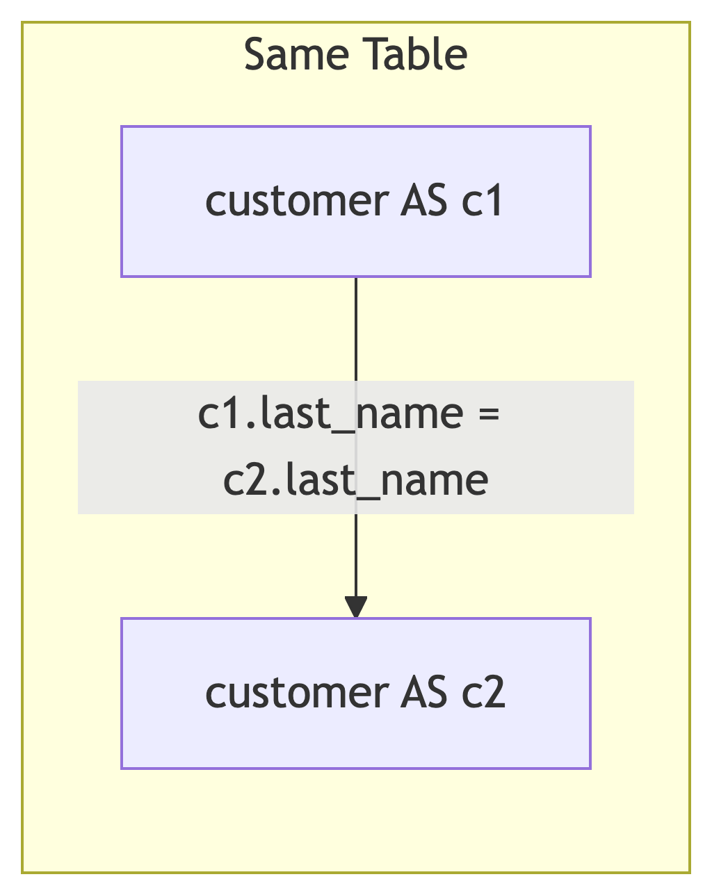 c1 and c2c1.customer_id < c2.customer_id prevents duplicate pairsSelf joins work well for parent-child relationships: