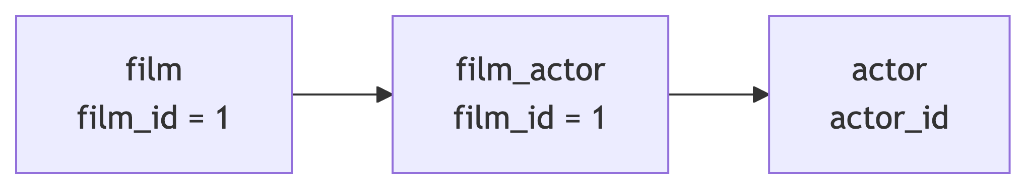 film to film_categoryfilm_category to categoryThe film_actor bridge table connects films and actors: