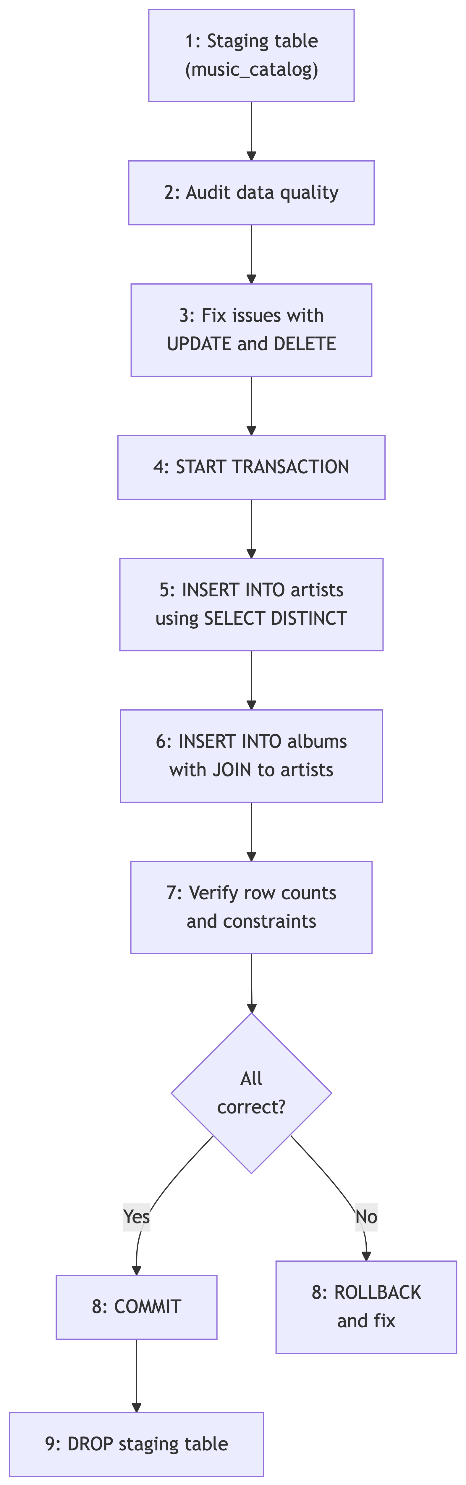 You have the music_catalog staging table and the normalized artists and albums tables from the previous lecture. Your job: audit the staging data, fix the problems, and migrate the clean data into the normalized schema.