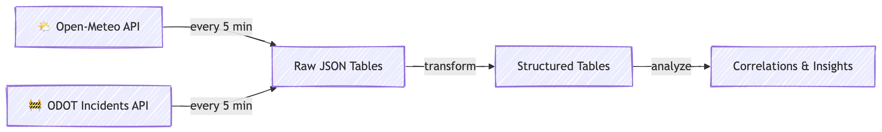 We are building a pipeline that continuously collects data from two public APIs, stores it in a cloud database, and transforms it into structured tables ready for analysis.