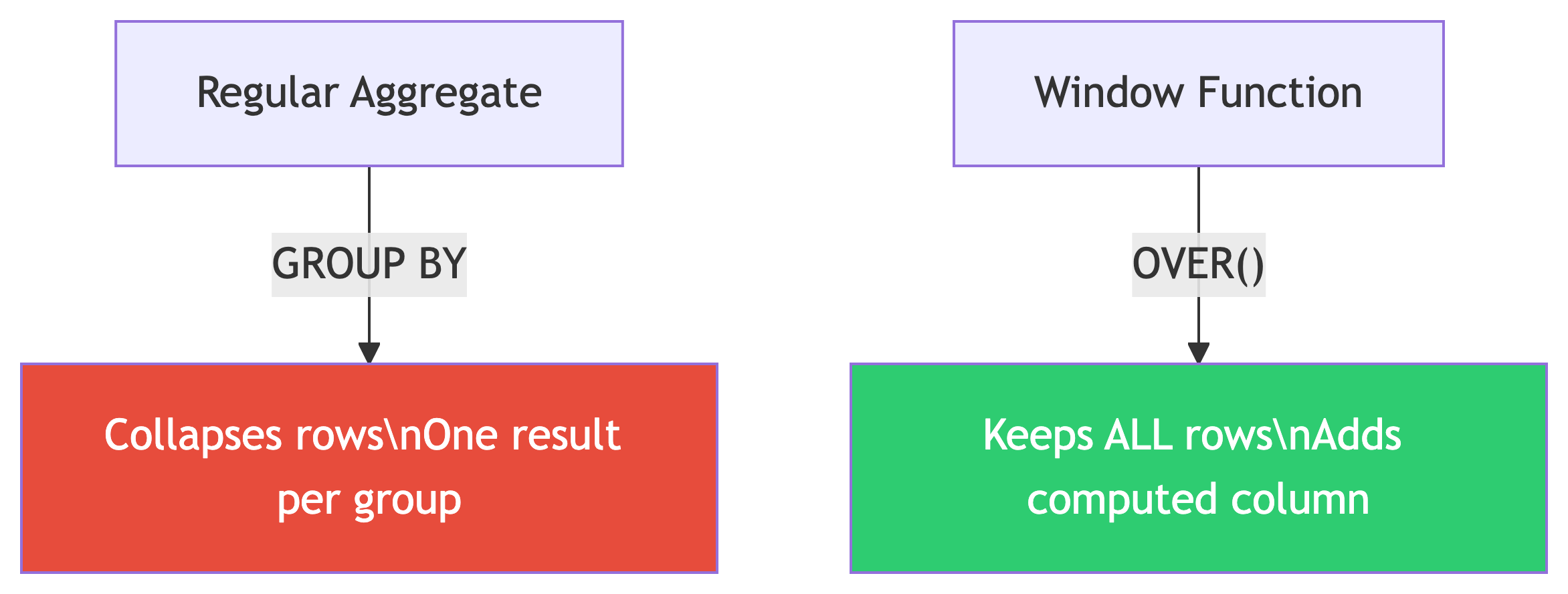 | Windows | OVER(), PARTITION BY, frame clauses |