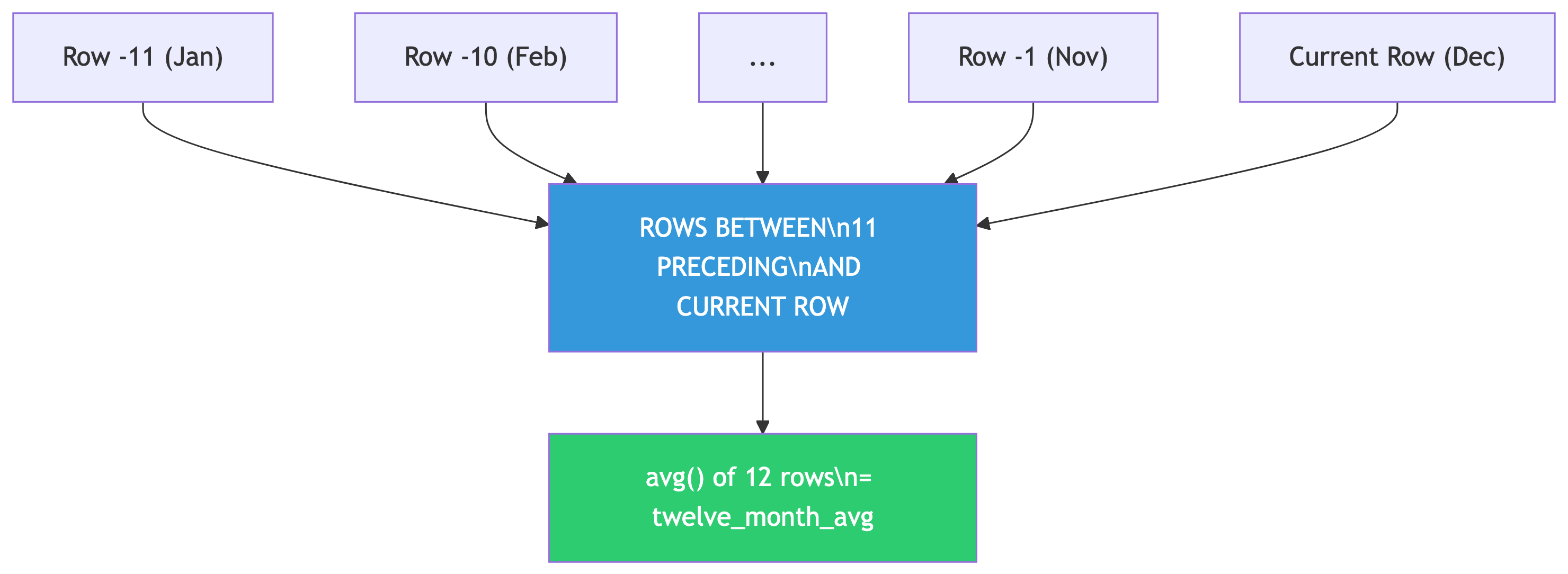 This computes the average of the current row plus the 11 rows before it (12 months total). The window slides forward one row at a time.